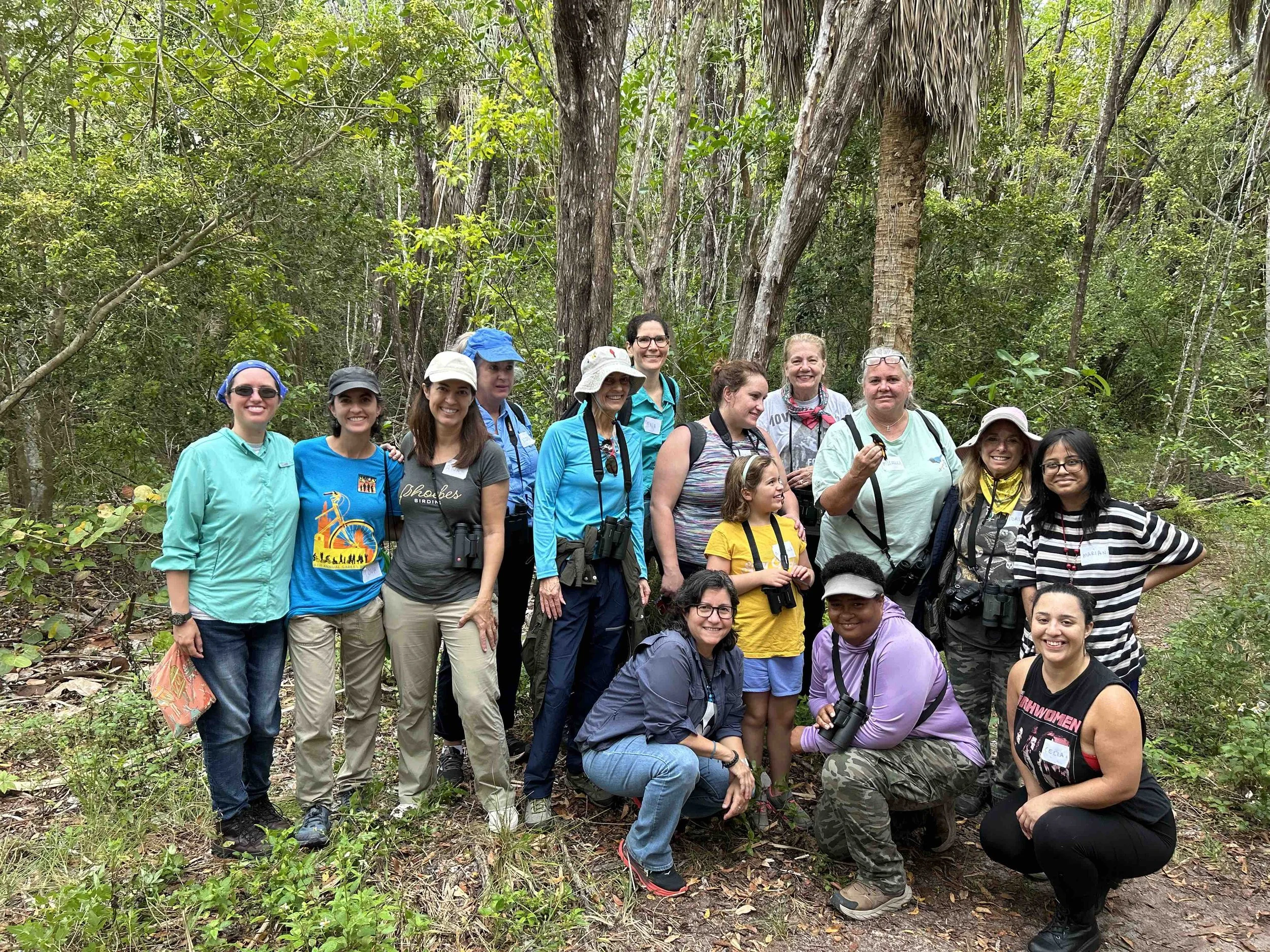 Phoebes gather at the Cape Florida Banding Station for a walk and tour led by Banding Station Director Michelle Davis, (pictured third from left, back row, holding a banded bird shortly before releasing it to the wild).